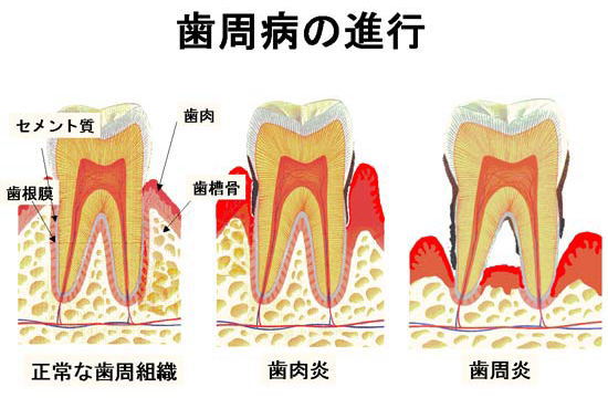 歯周病とは、口腔内の細菌が歯と歯ぐきの隙間(歯肉溝、歯周ポケット)に停滞し、そこで炎症を起こして、歯ぐきからの出血や歯ぐきの下の骨(歯槽骨)の吸収といった症状を引き起こす疾患です。慢性的な疾患で、長い年月をかけて徐々に骨の九州が進行し、末期には歯を支える骨がほとんどなくなって、歯が動揺し抜け落ちてしまいます。このような最近は歯石として歯面に沈着し、また増殖し深部へと進行していくのです。一般的な治療法は原因菌の除去、歯石除去、再発予防のブラッシング指導が主で、吸収した骨をもどすことは一部には可能ですが、ほとんどが歯周病の進行抑制の治療となります。したがって、早期治療・予防が最も効率的です。